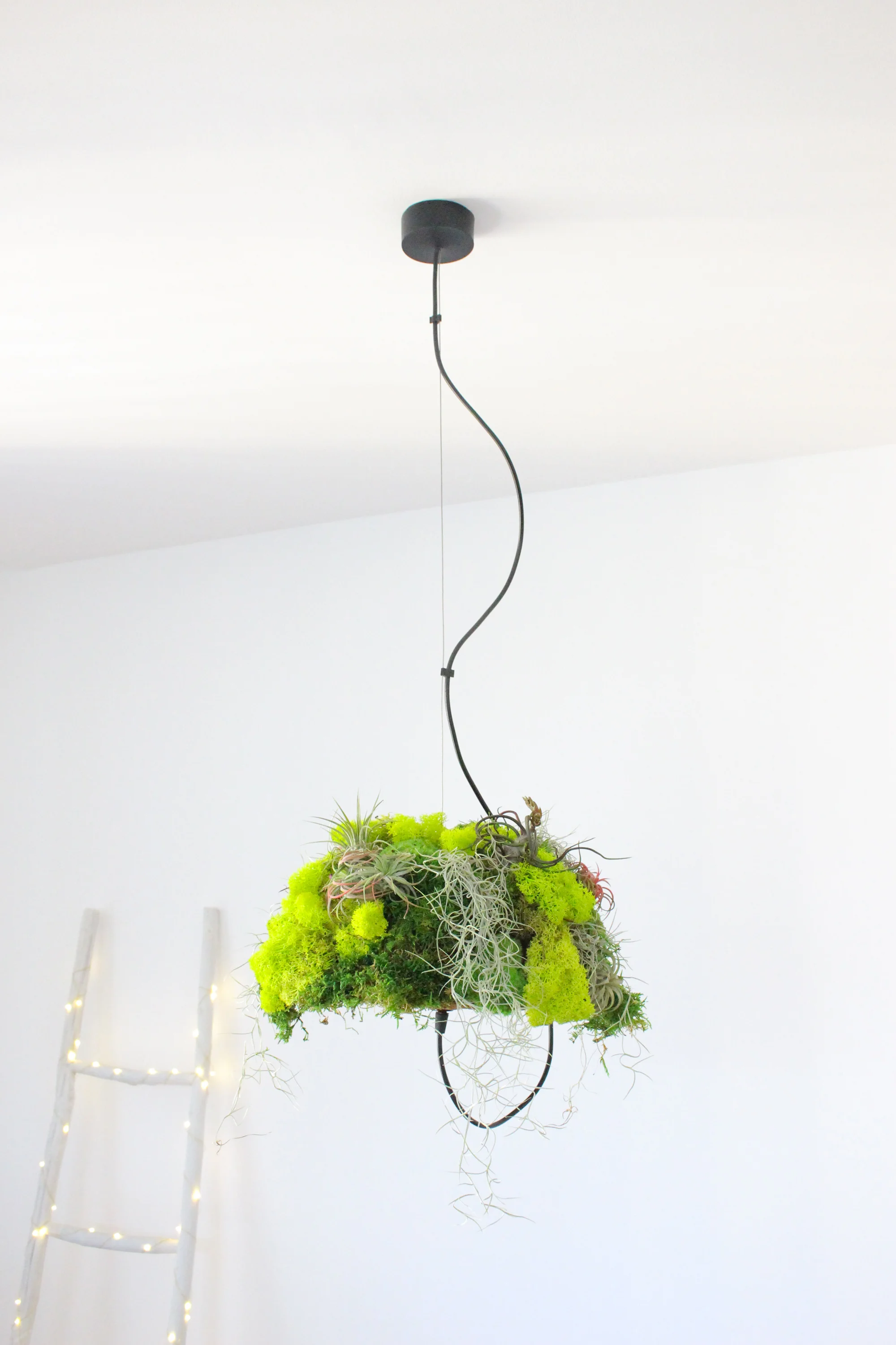 De esta manera podemos ofrecer distintas tonalidades de verde junto con especies que aportan color y volúmenes a la estructura, consiguiendo así una lámpara natural que crece e incluso puede generar pequeñas flores de manera ocasional.