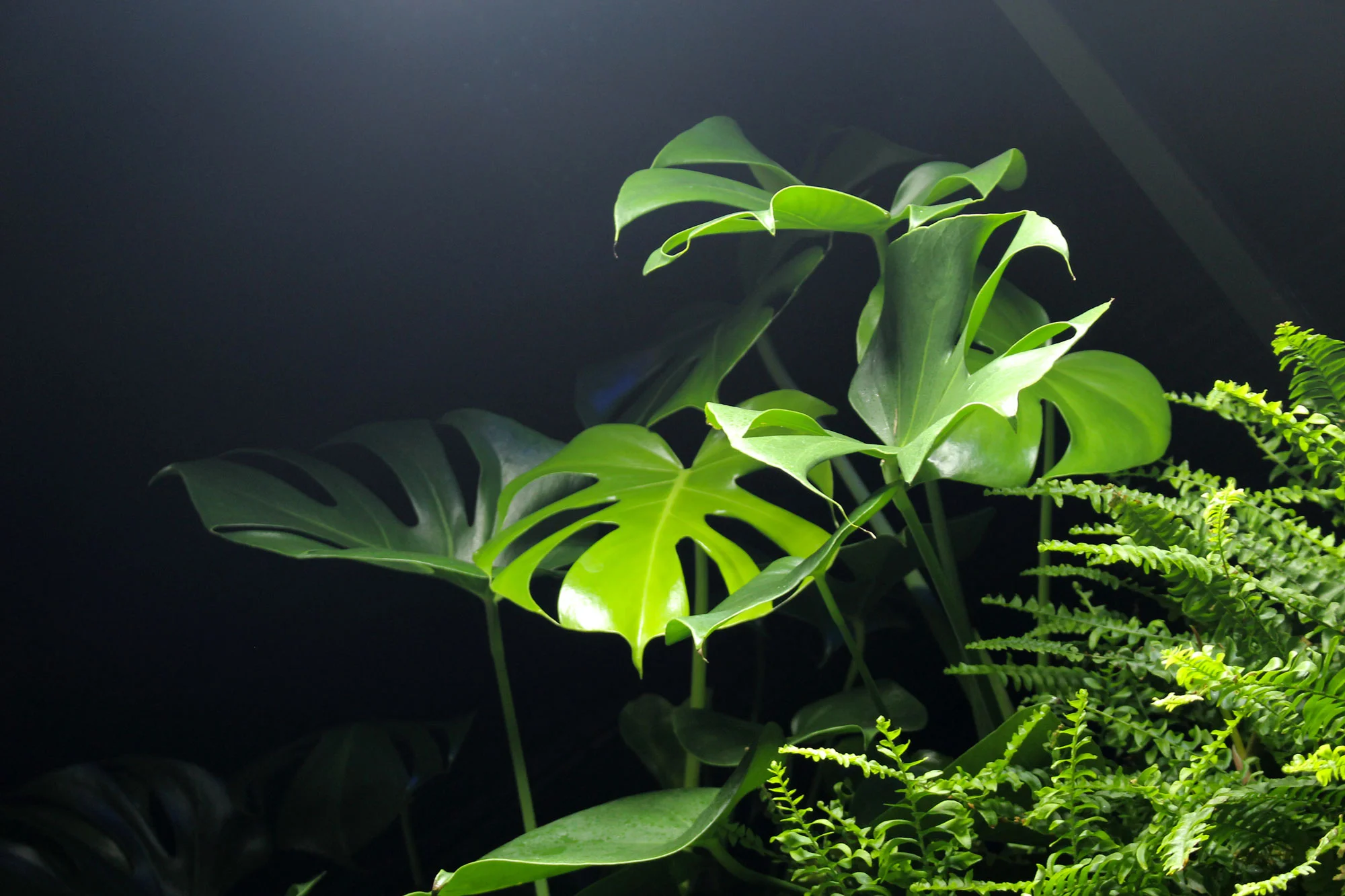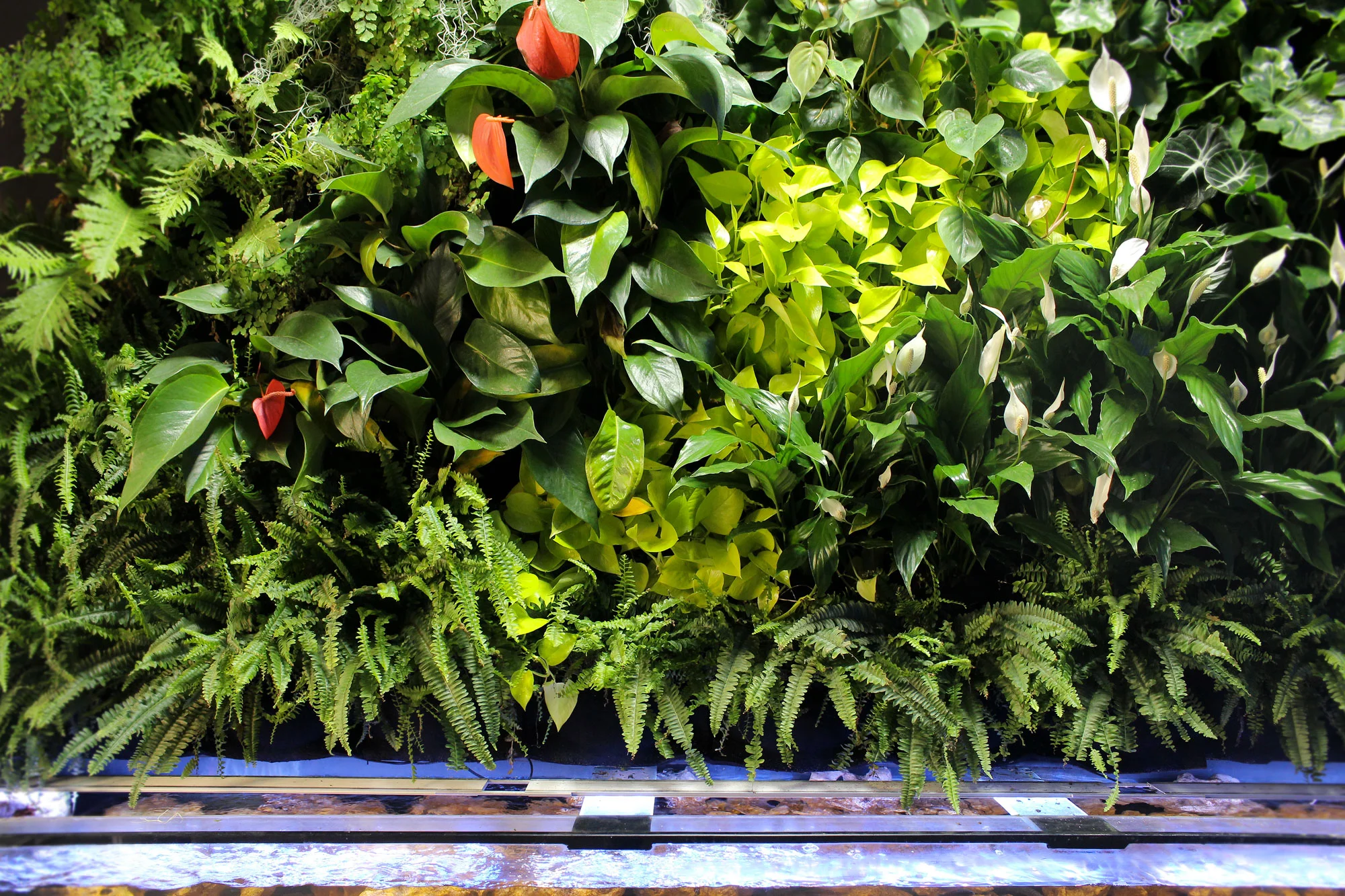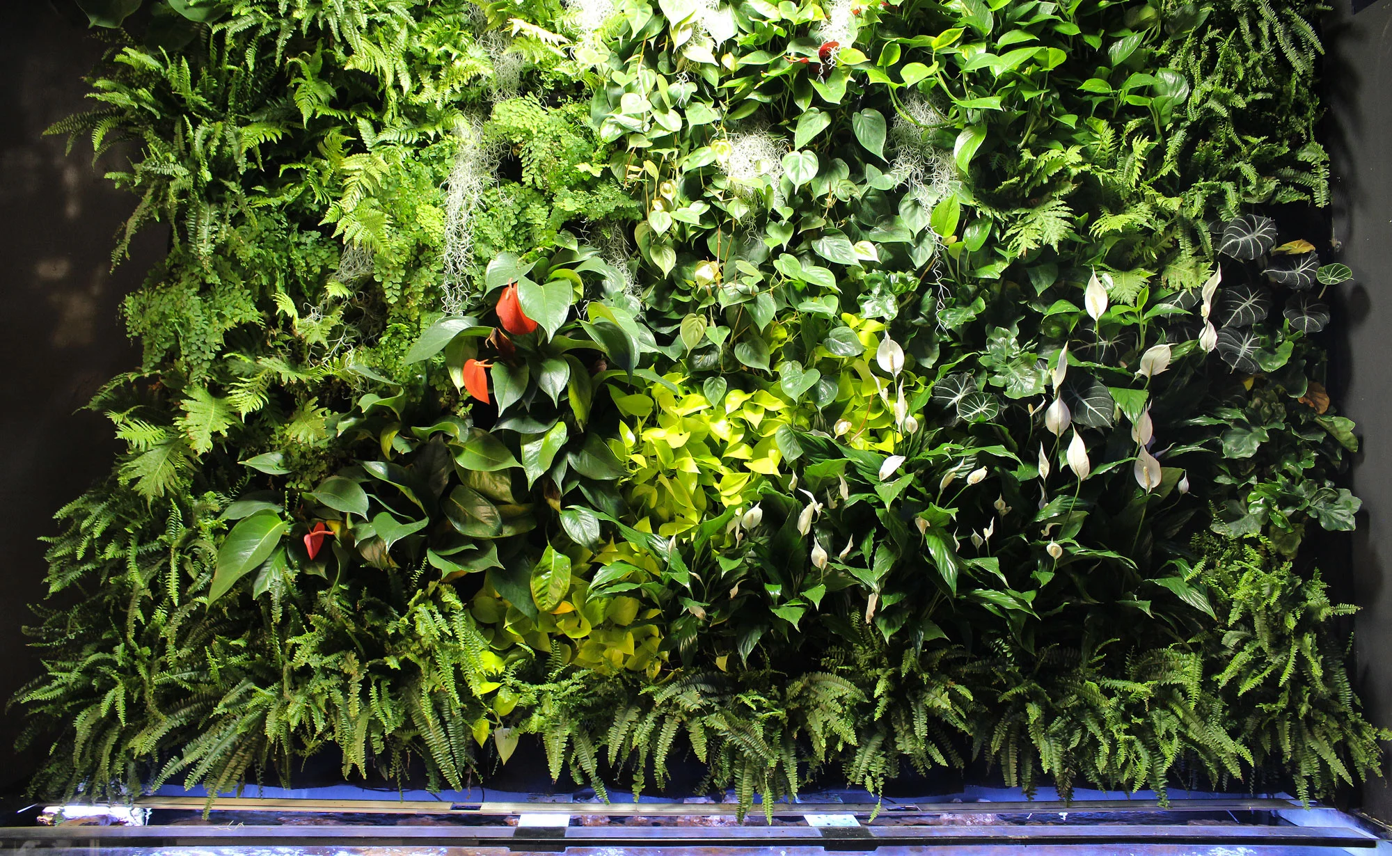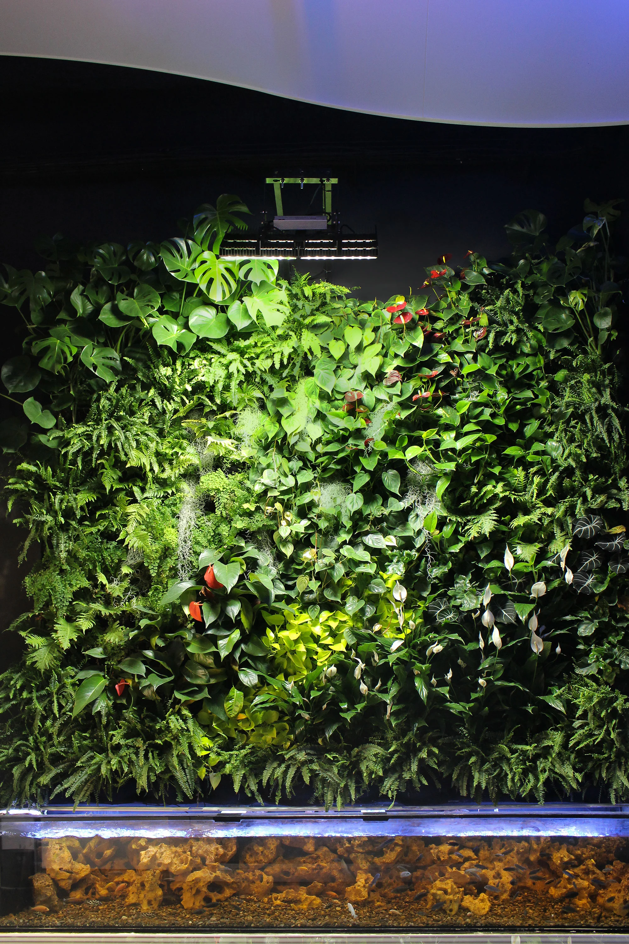 A sus pies, un acuario de 3 metros de peces Tanganica que aporta al jardín agua, humedad y nutrientes, actuando como sistema de riego en sí mismo. Mientras el jardín oxigena el agua para los peces, reproduciendo el equilibrio natural entre peces y plantas.