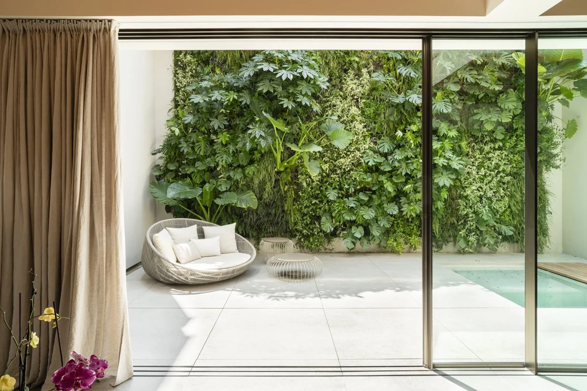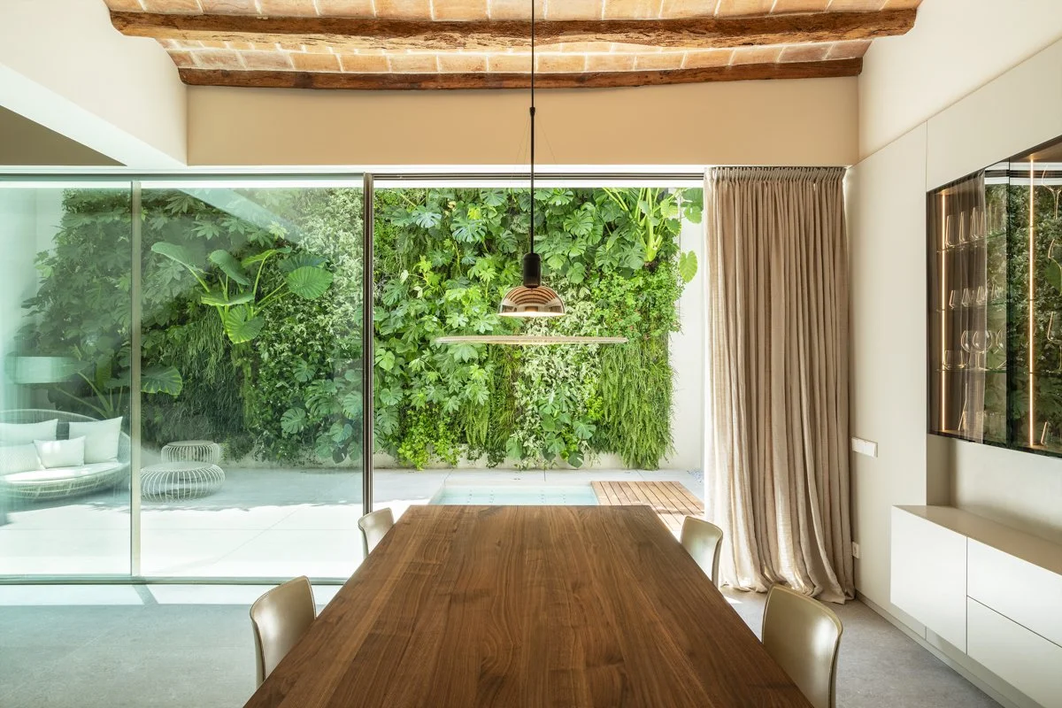 Este proyecto integra un ecosistema vertical en una vivienda unifamiliar en Sant Cugat del Vallés. El jardín, proyectado sobre una pared de un patio semiexterior, ocupa aproximadamente 48 m² (5,8 x 8,2 m) y se convierte en el protagonista de las vistas desde la zona comedor y las habitaciones superiores.