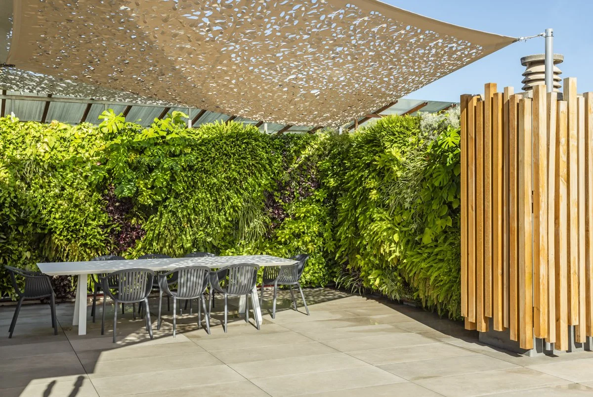 Una pared lateral revestida en listones de madera, adornada con especies colgantes y trepadoras, suaviza las vistas laterales y anticipa el ambiente del siguiente espacio. En continuidad, la zona de comedor de la terraza se transforma mediante un jardín vertical envolvente, utilizando especies que ya aparecen en la primera zona para crear coherencia.